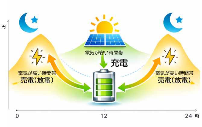 電気の値段が安い時間帯(夜や休日)に電力を買って蓄電池に充電し、値段が高くなる時間帯(昼間やピーク時)に放電し、電力を売ります。