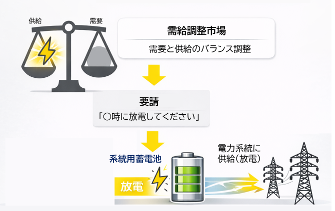 その電気をため、電力が必要なタイミングで供給することで、電力の安定供給に貢献しながら市場から対価を得られる