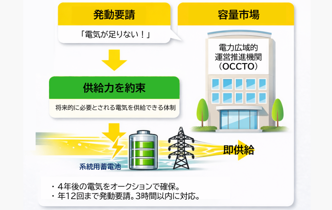 実際に電気を出す場面は年に数回(最大12回程度)、そのための「待機料」のような収益が得られます。