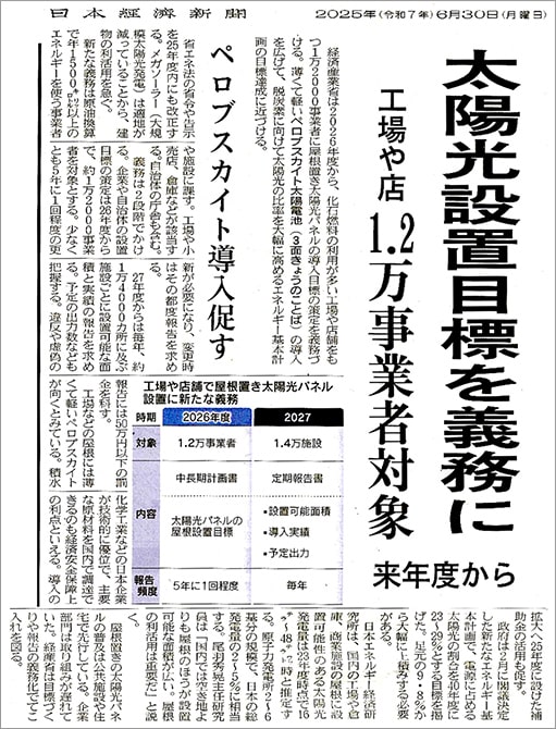 さらに今年6月、日本経済新聞でも大きく報じられた通り、経済産業省は2026年度から工場や店舗など 1.2万の事業者 に対し、太陽光パネルの屋根設置目標を義務付ける方針を打ち出しました。