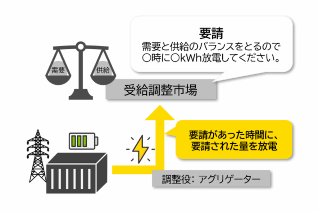 電力会社(送配電事業者)が、電気のバランスを調整するために「電力がほしい」と呼びかけ。蓄電池に貯めていた電気を放電し、その協力の対価として報酬がもらえるモデルです。