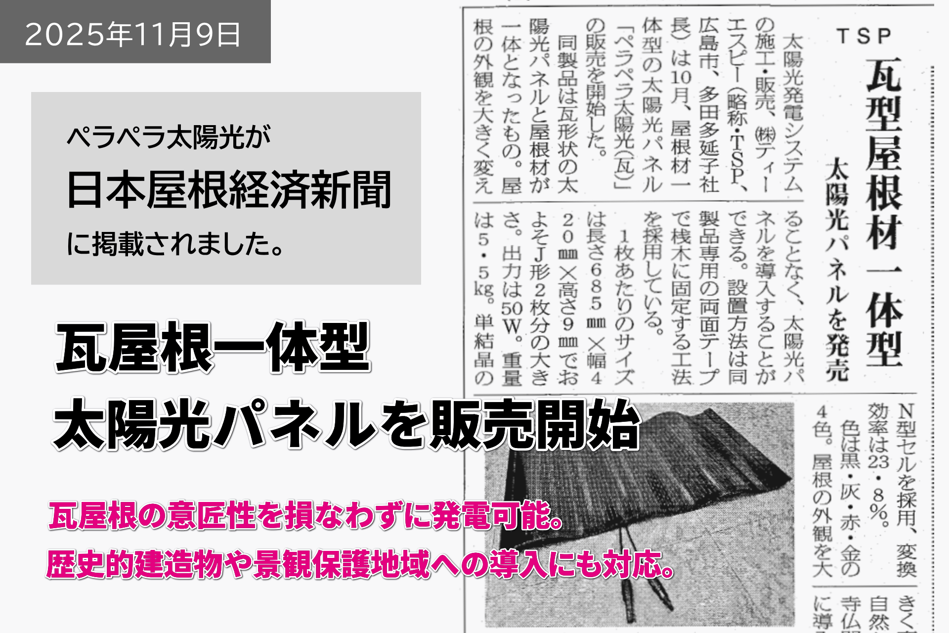 記事では、瓦屋根の意匠性を損なわずに太陽光発電を可能にする画期的な製品「ペラペラ太陽光瓦(瓦)」が紹介されました。歴史的建造物や景観保護地域への導入にも対応できる仕様であることが注目されています。