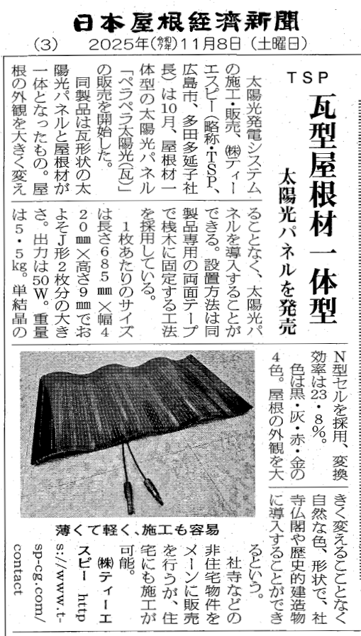 当社の新製品「瓦型屋根材一体型太陽光パネル(ペラペラ太陽光瓦(瓦))」が、屋根業界専門紙『日本屋根経済新聞』に掲載されました。