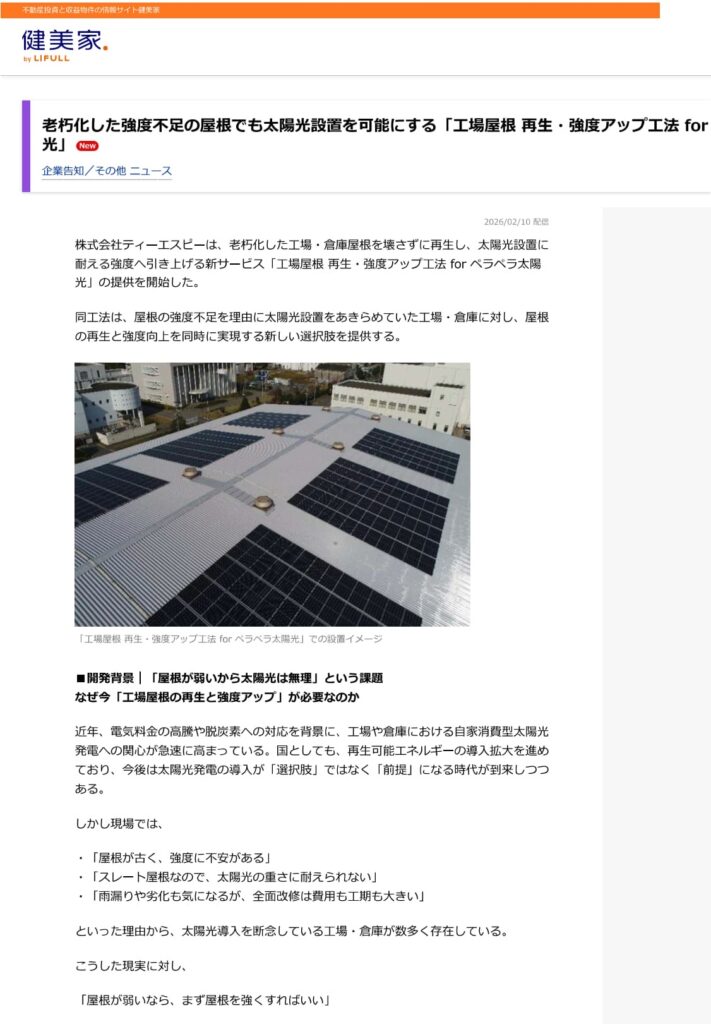 老朽化した強度不足の屋根でも太陽光設置を可能にする新工法として、当社の取り組みが紹介されました。