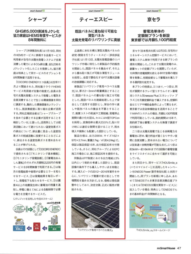 既存太陽光パネルに重ね貼りできるリパワリング向け薄型太陽光として、当社の「ペラペラ太陽光」が紹介されました。